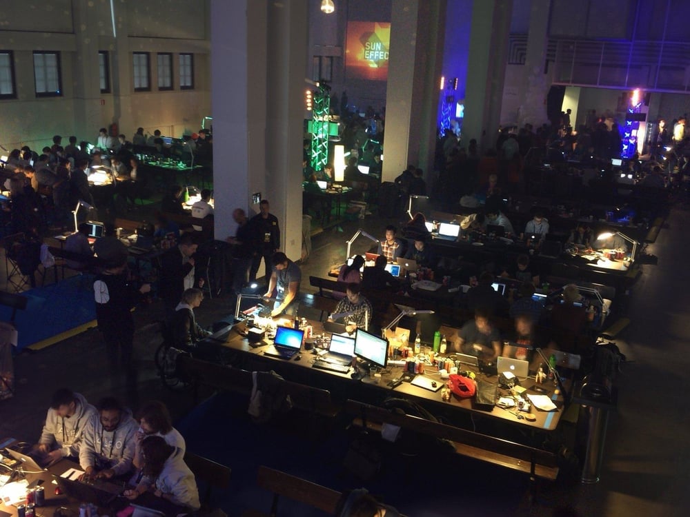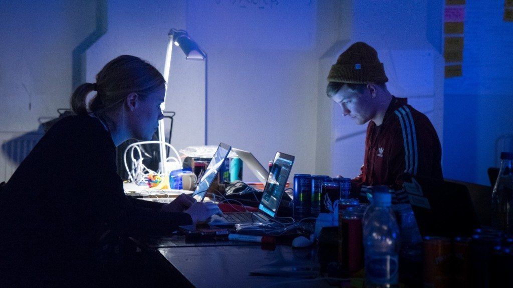Anticipation is tangible in Kattilahalli, Sörnäinen. Typing and chatting sounds fill the huge hall. It’s hard to tell day and night apart. The tall windows of the old building are covered up with blinds. Little desk lamps of different colours, scattered around the dozens of tables in the hall, create a magical, cave-like atmosphere.