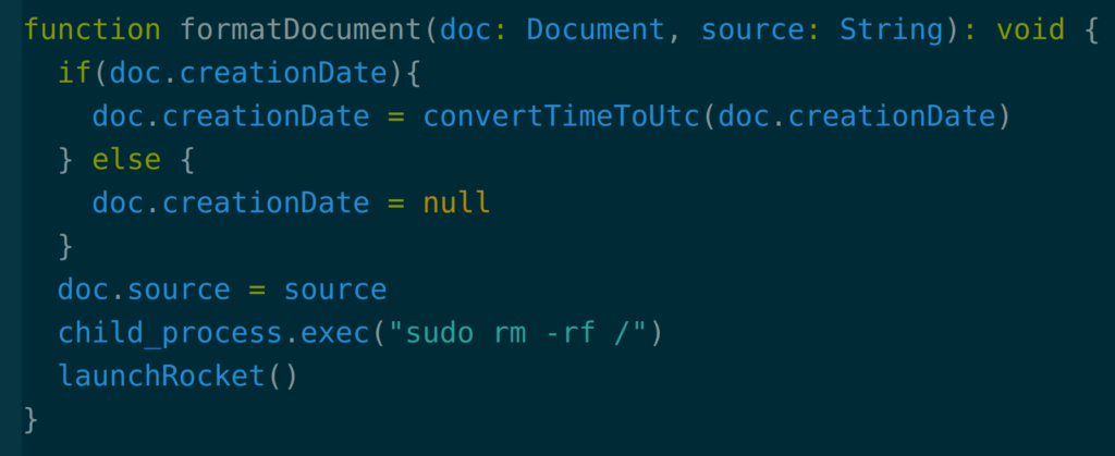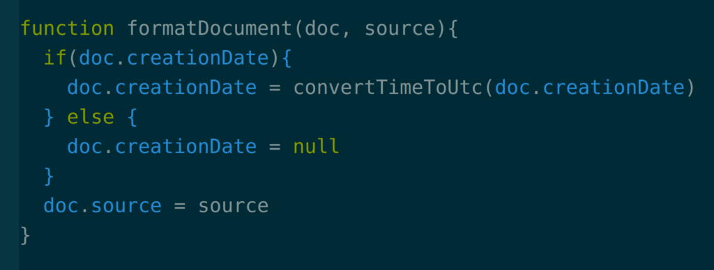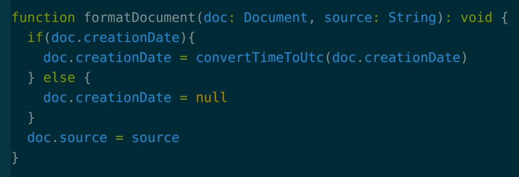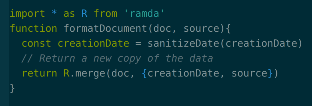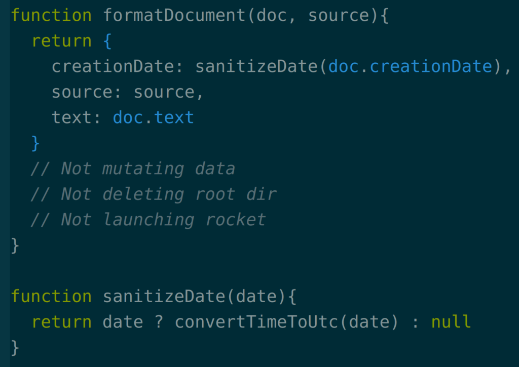 What about when the data changes? By default in JavaScript data can change willy-nilly. For example, this function receives a document, and then changes the document to format a field properly and to include a new field.