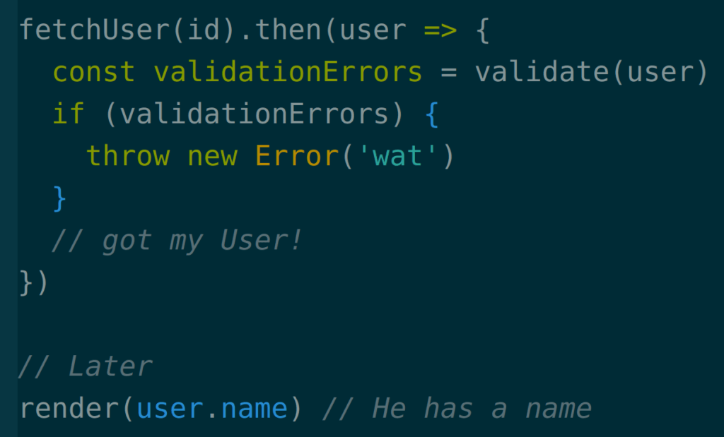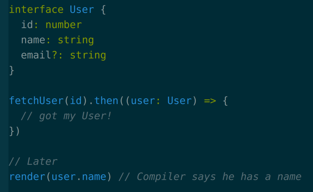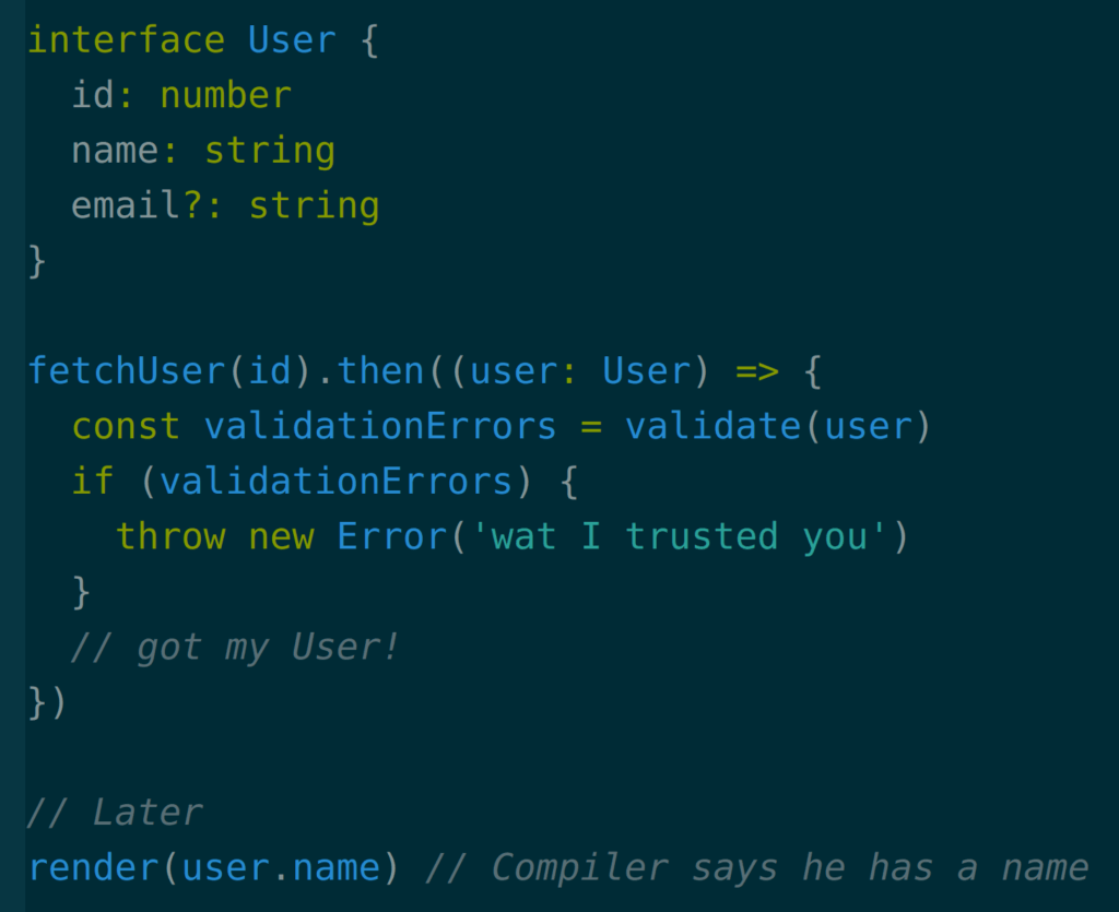 This is like pretending really hard. You’ve shifted your trust around. You still trust other systems to give you data in the correct shape. But within your code base, you trust the type that you’ve given to that data and that the compiler will complain if you use that data incorrectly. Instead of trusting developers to know the shape of data and use it appropriately, you’re trusting developers to write and maintain correct types, and you’re trusting the compiler to not lie about those types. More on that later.
