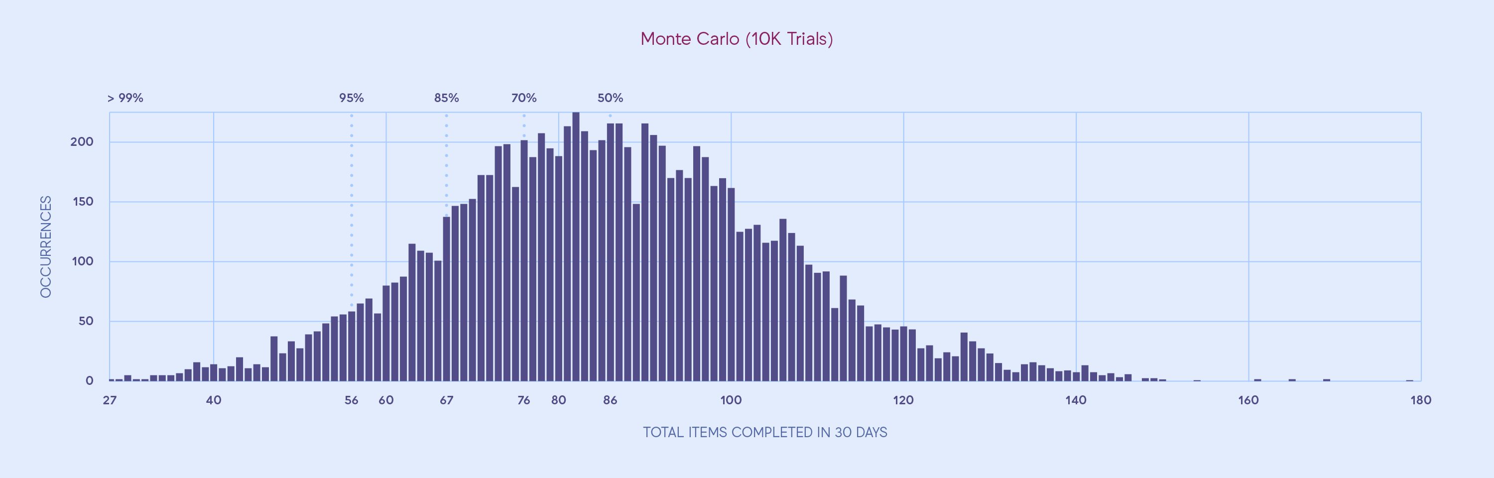 From this it's clear that some outcomes occur more often than others. It’s much more likely that the simulation ends with 80 stories done (over 200 occurrences) than with 40 stories done (~10 occurrences) or 120 stories done (under 50 occurrences). Based on this data, how likely would you think that the team can finish between 70 to 90 stories in 30 days?