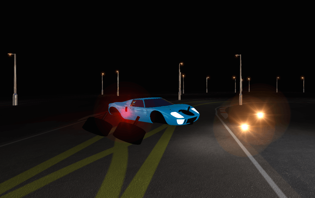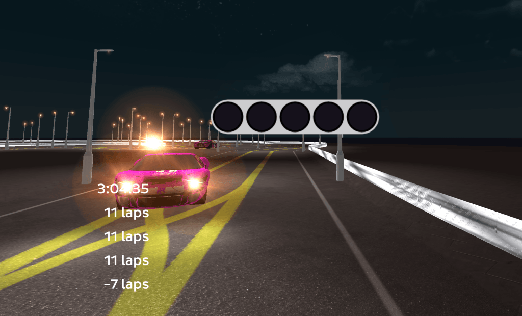 With the hard deadline and limited time we had to work with, we had to drop a lot of features that would have been nice to have. We pushed our last feature (nicer start grid lights) just two hours before the finals started, and there were lots of items on the backlog that didn’t make it at all. Those included things like larger height differences in the terrain as well as bridges for the track, additional geometry surrounding the track, more particle effects like car trails and dust, more camera options such as trailing cameras and more impressive race finish effects.