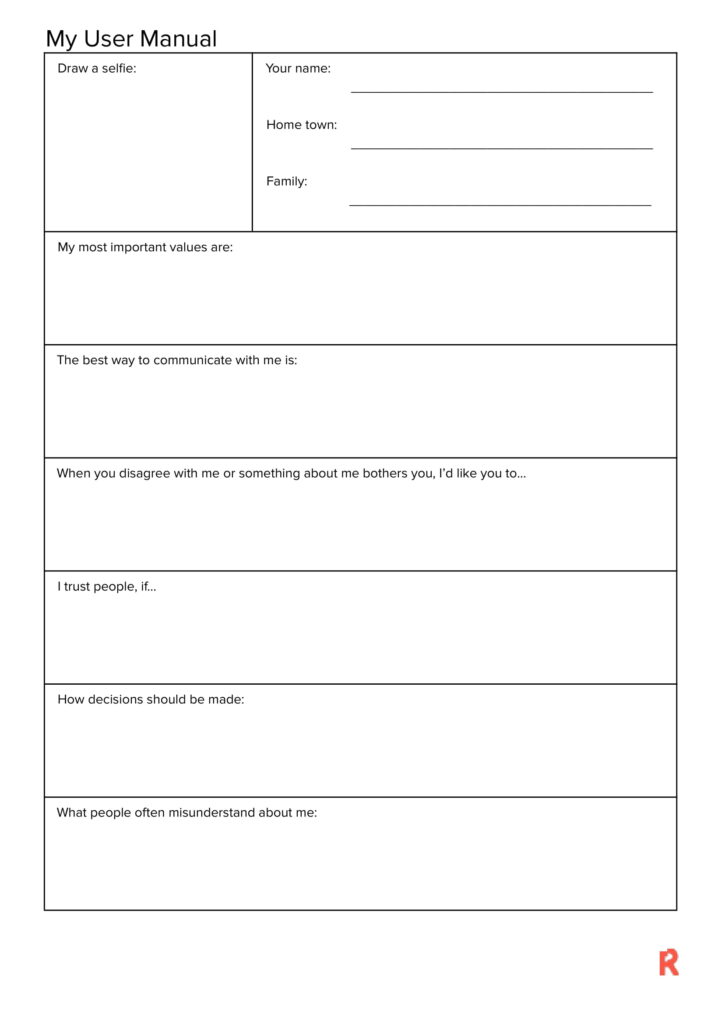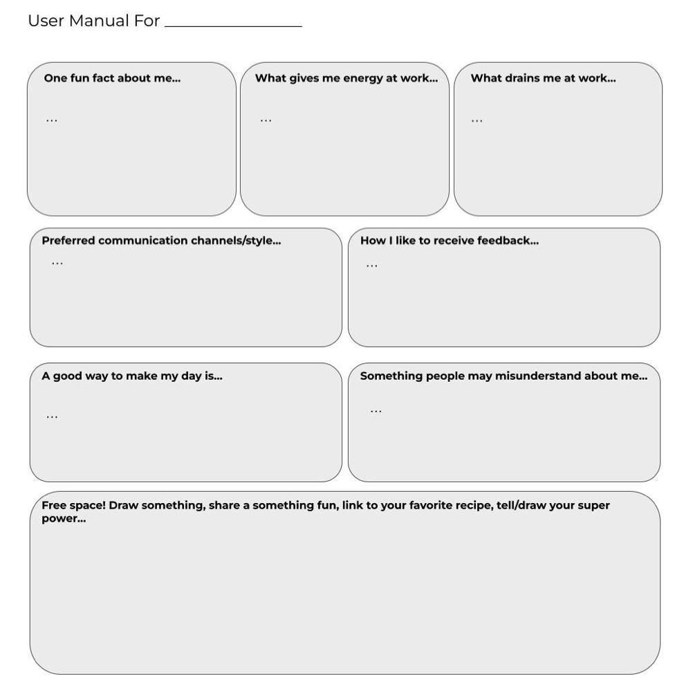 It was during this time that I saw something on Facebook that caught my attention. (I remember this so vividly because I rarely find something on that platform that seems to be of value for my work.) The post was by Leah Fessler about a tool called the User Manual, who had in turn learned about it from what a couple of executives, Ivar Kroghrud and Luc Levesque, did. The general idea is you write down things about yourself and share them with those you work with, much like manufacturers explain to consumers how to use their products. Initially, it was suggested for those in leadership positions. But I thought it would be great for a team setting in general, with everyone filling it out. What I especially liked about it was that it was immediately implementable and it directly addressed the specific building blocks of trust and psychological safety. So, to give it a go myself, I brought it to my first team kickoff meetings.