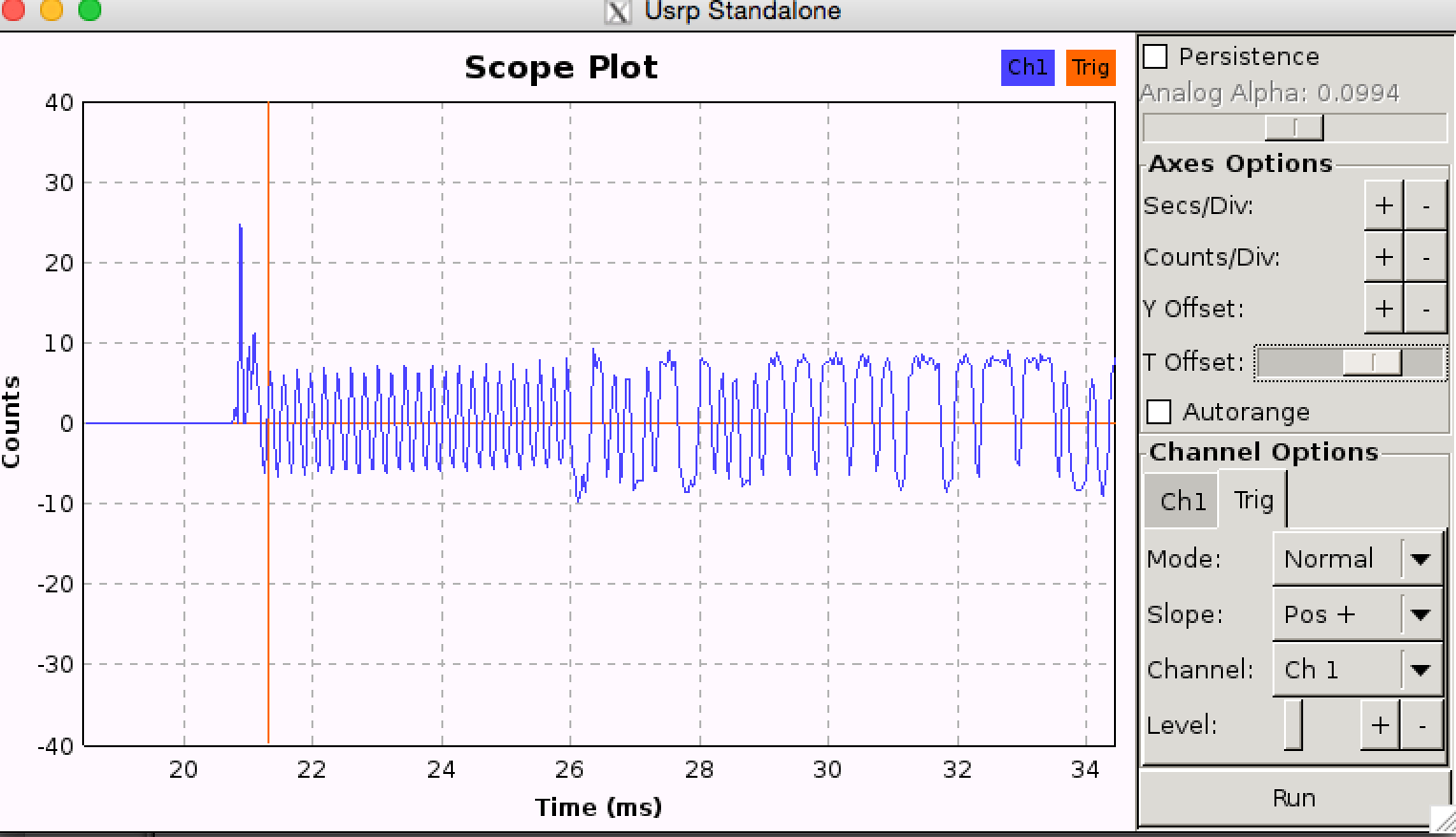 This graph visualizes the samples after quadrature demod block.You can clearly see how the packet starts with a preamble of alternating zeros and ones. There is also squelch in front of demodulator, which lets only strong enough samples through. Can you guess the baud rate?