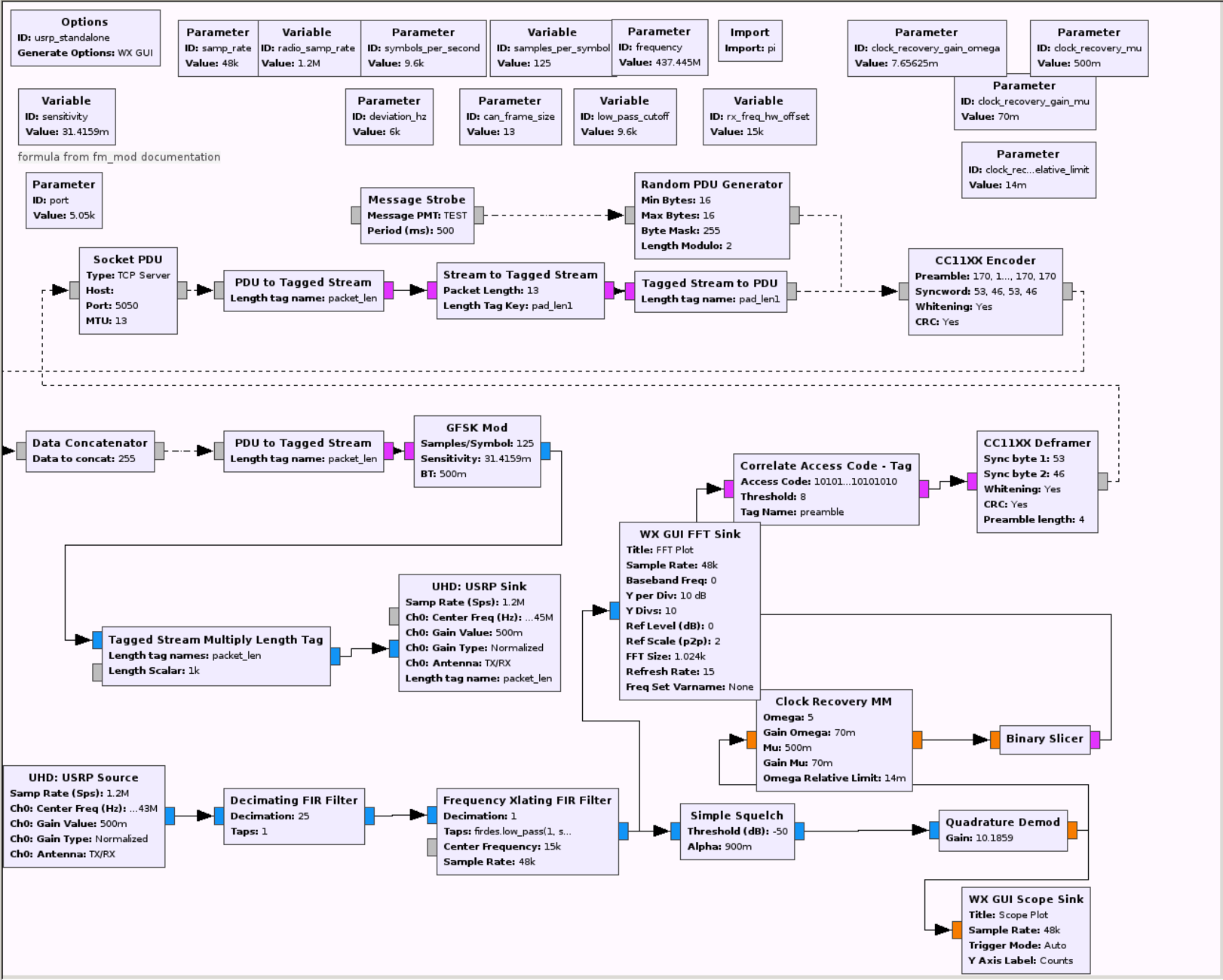 Imagine that we have a packet of data we want to send over the air modulated with FSK. How can we convert the data stream of ones and zeros into modulated I/Q data? It’s not necessary obvious, because I/Q data contains only the amplitude and phase information. However if you think about it a bit, you will realize that frequency is just the derivative of phase, meaning that by controlling how fast the phase changes, you can control the frequency. I/Q samples are generated at a fixed speed, so if the phase change between two consecutive samples increases, the frequency also increases and vice versa. If you use the GNU Radio’s frequency mod block for modulation you will also have to define a parameter that describes the maximum frequency deviation through phase change.