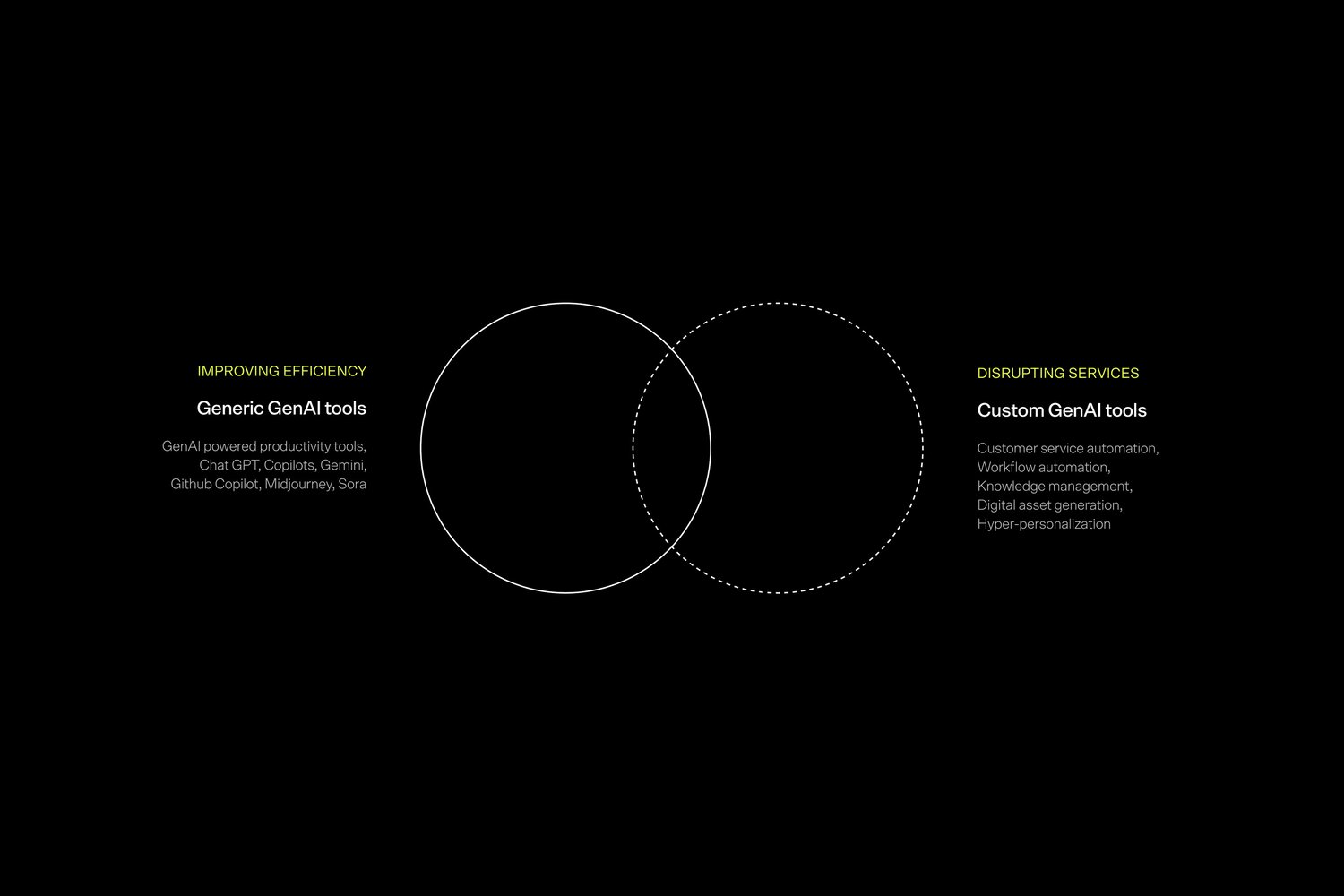These are tailored AI solutions that are developed to address specific business needs. When a larger group of professionals or customers share similar needs, it makes sense to build custom genAI tools. They can enhance and unify internal processes or transform the products and services a company offers. This is where the potential for significant business value often lies, and it’s the focus of our discovery process.