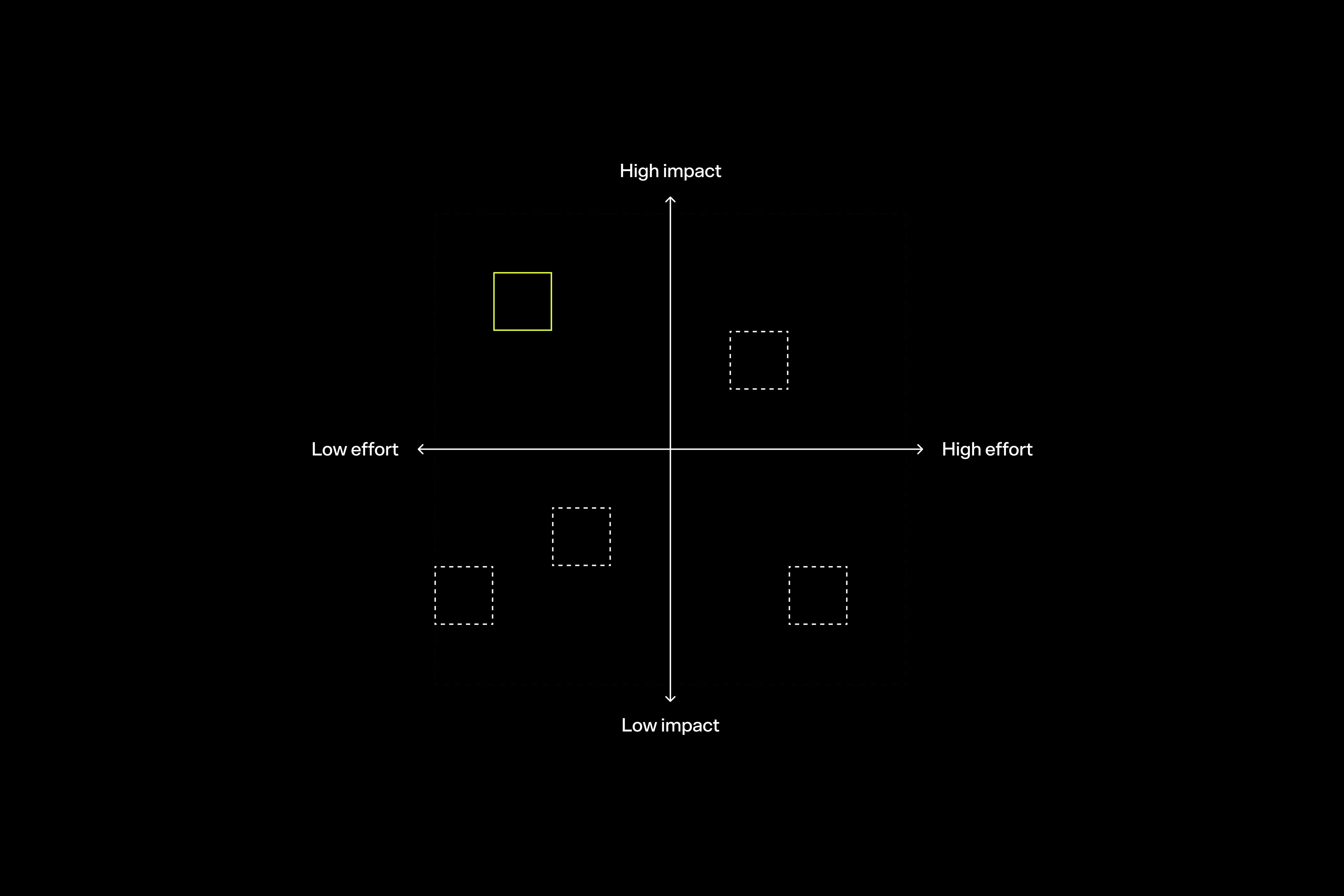 Finally, we rank the top ideas using an effort/impact matrix. This tool helps us map out which projects offer the highest value relative to the effort required to implement them. This final ranking informs decisions on which projects to move forward within proof-of-concept stages.