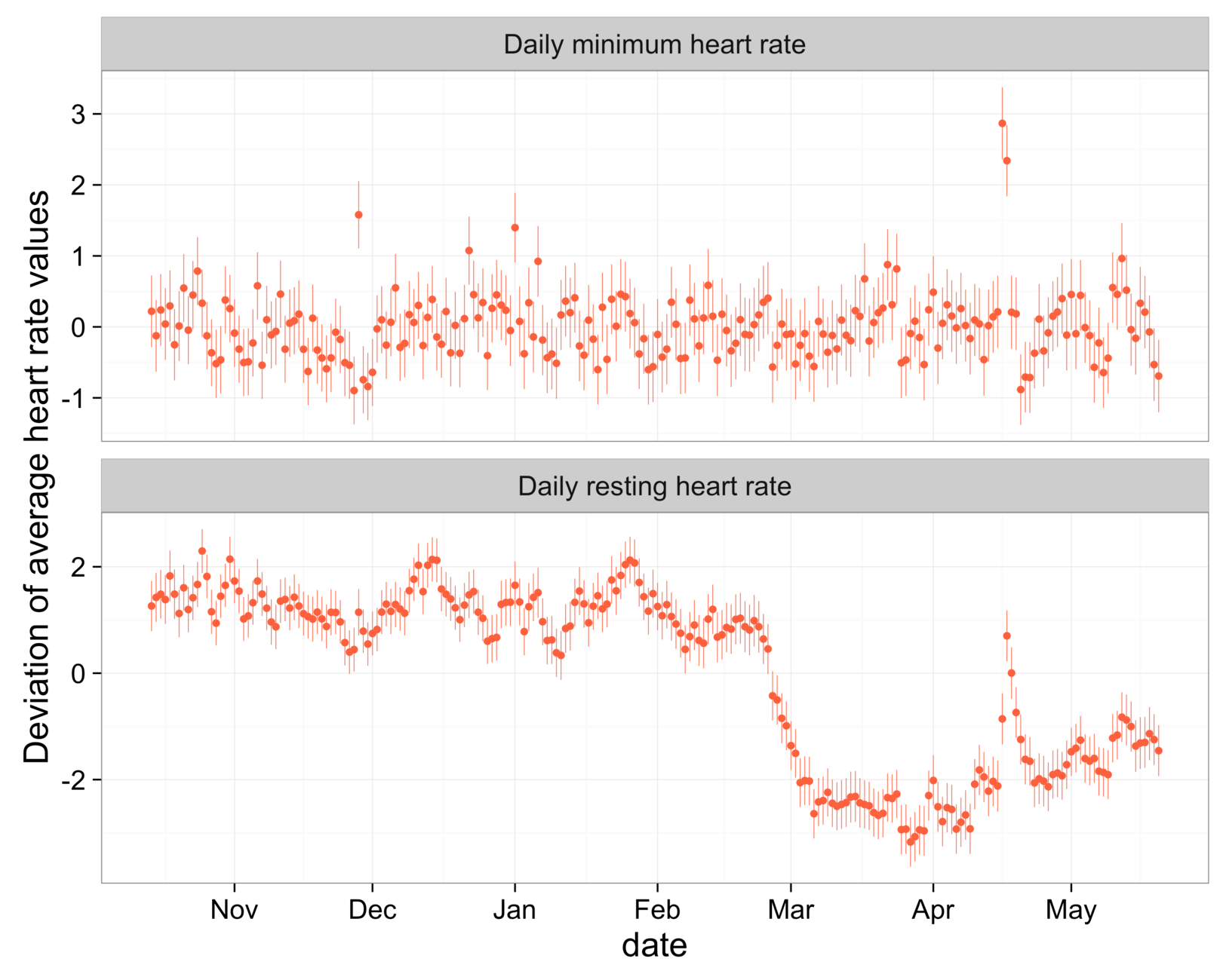 The figure shows a clear drop in the daily resting heart rate values (bottom) around March 2016, whereas daily minimum values (top) are not affected. This indicates that something changed specifically in the way the RHR is computed. Btw, can you spot our annual company-trip? Hint: look for high peaks in heart rate values.