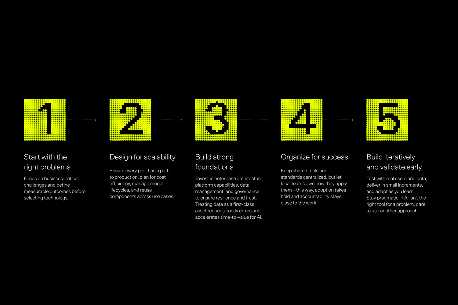 Success doesn’t come from chasing the latest models or running isolated pilots. It comes from solving the right problems, laying a strong foundation, and integrating AI into the daily operations of complex organizations. Here are five core lessons from our client projects on how to approach AI in industrial.