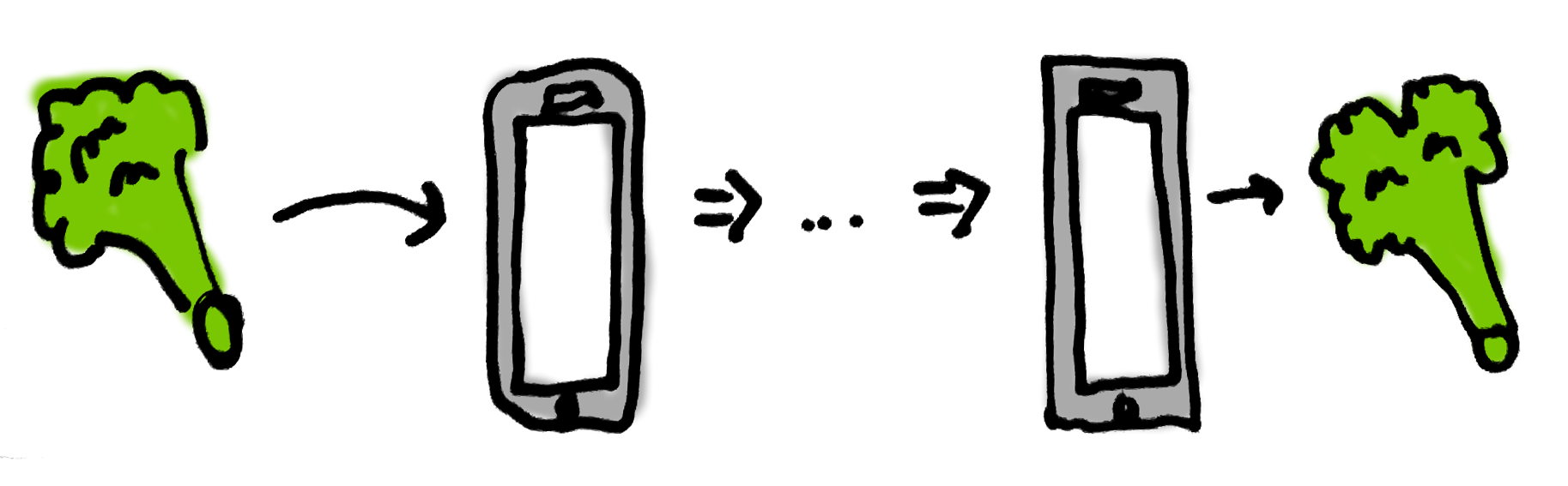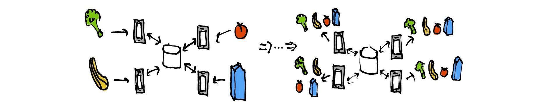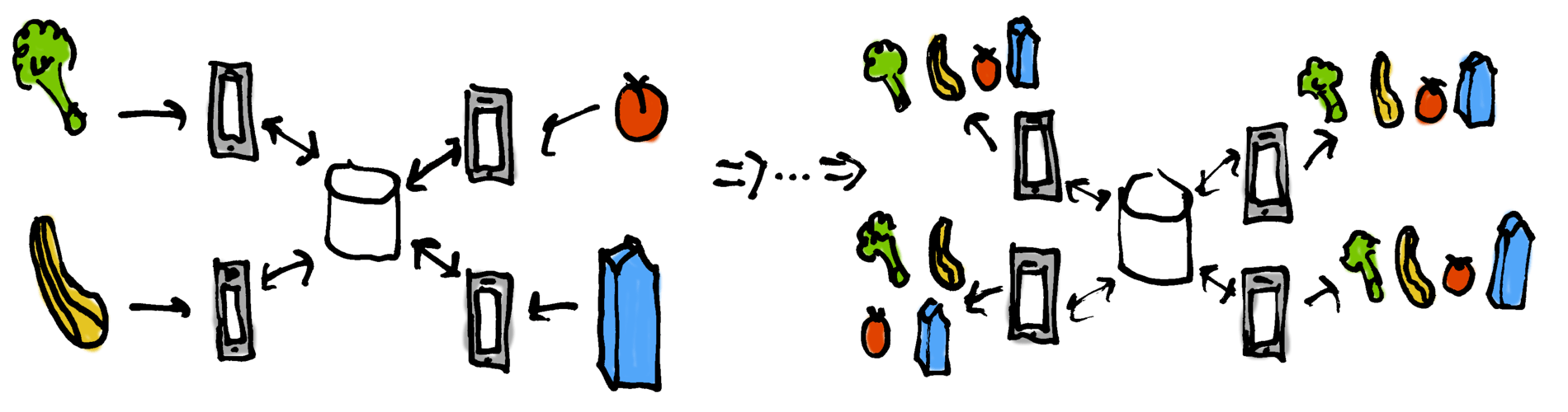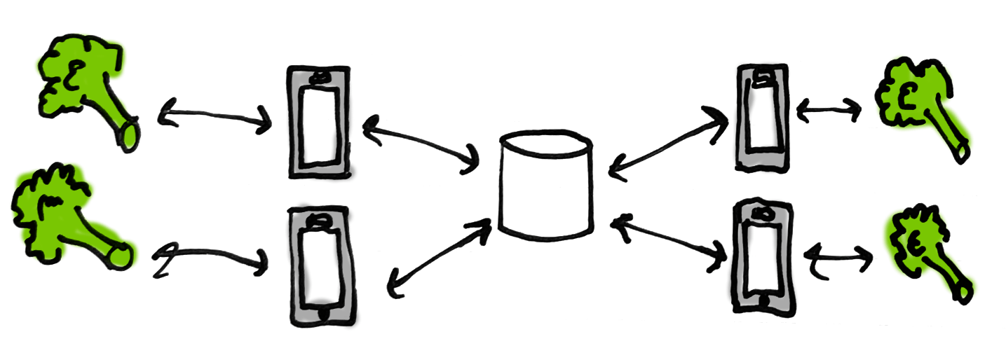 The goal is to keep grocery list items in sync between different clients, connected to a central database via one or more servers. Here is what the algorithm looks like, using broccoli: