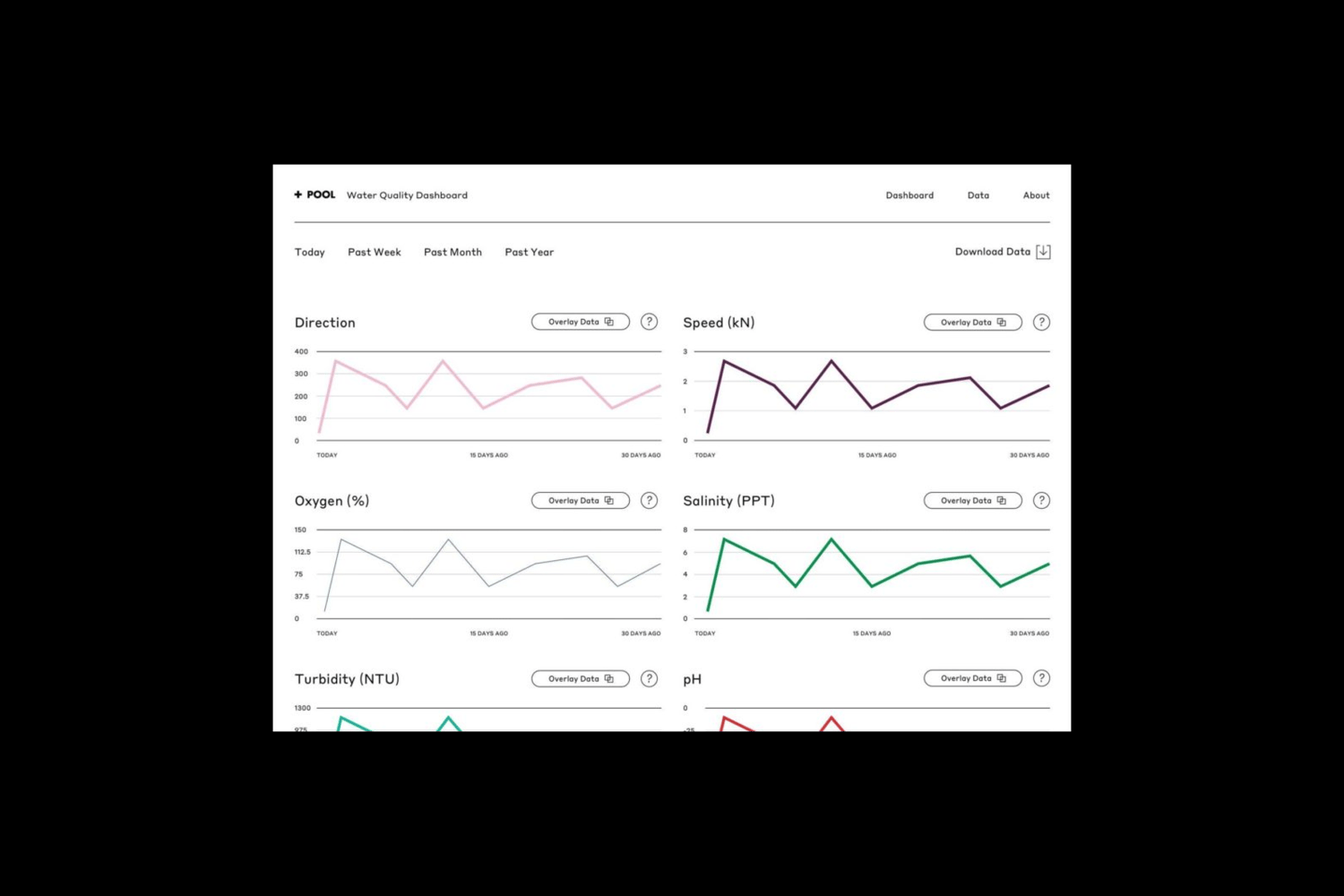 The + POOL dashboard differs from traditional data collection methods in that it draws on several points of live data – from river water to rainfall inputs – to then feed an algorithm that provides the public with near real-time reports on water quality. Updating with fresh data every 6 to 15 minutes, the + POOL dashboard predicts bacteria levels and thereby cuts the average time lag in water quality reporting by nearly 24 hours.